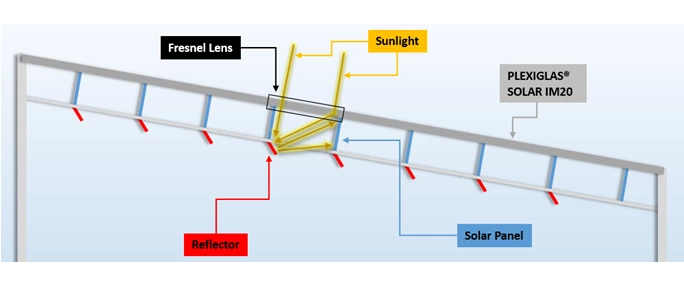 Instead the team has come up with a novel design where the special architecture of the sunlight modulation roof let’s through 20% of the solar energy for illumination while 80% are used for photovoltaic power generation. Extrusion in the production process turns the transparent PLEXIGLAS® roof into a Fresnel lens structure that focuses the light onto the reflector mounted underneath. From there the light travels to the photovoltaic solar panel. Angle and size of the reflector are customized to meet regional and seasonal demands.